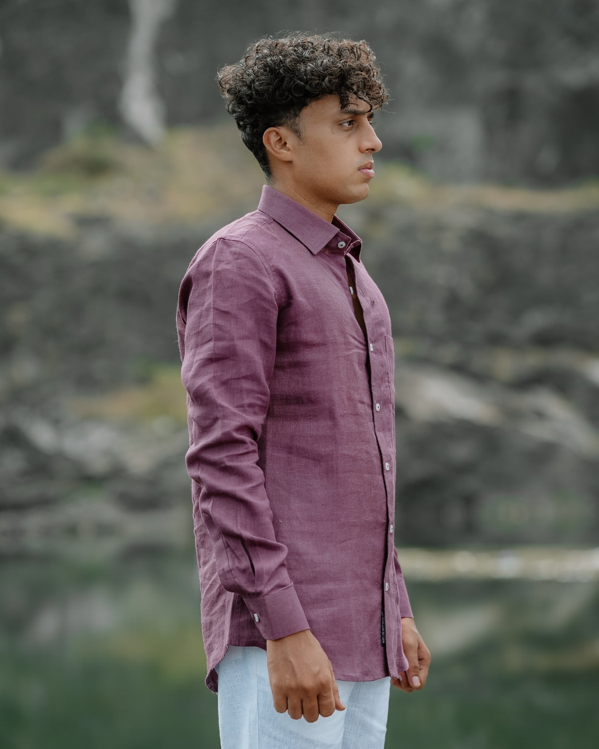This reddish-purple linen shirt exemplifies timeless elegance through its pure linen construction, offering superior moisture-wicking properties and natural breathability. The solid weave provides a refined aesthetic suitable for discerning tastes. Complemented by coordinating white linen trousers, this pairing creates a versatile foundation for refined dressing. Linen's inherent texture develops character with wear, while the fabric's durability ensures longevity. Ideal for warm-weather wardrobes, this combination transitions effortlessly from casual to semi-formal settings with minimal care requirements.